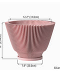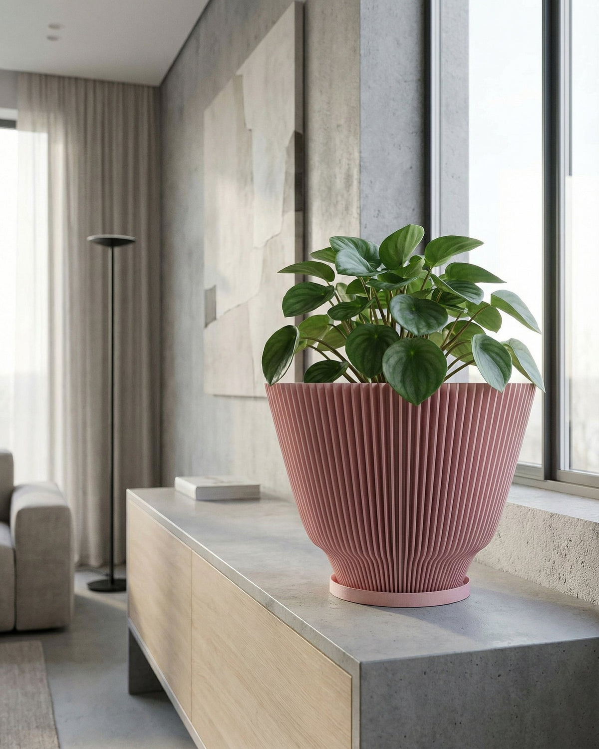 Imagine a blush-toned sunrise captured in a pot. This beauty, Made in Canada, brings a soft, sculptural elegance to any space. Crafted from plant-based plastic, its fluted design catches the light, creating a dance of shadows and highlights that perfectly complements your green friends.