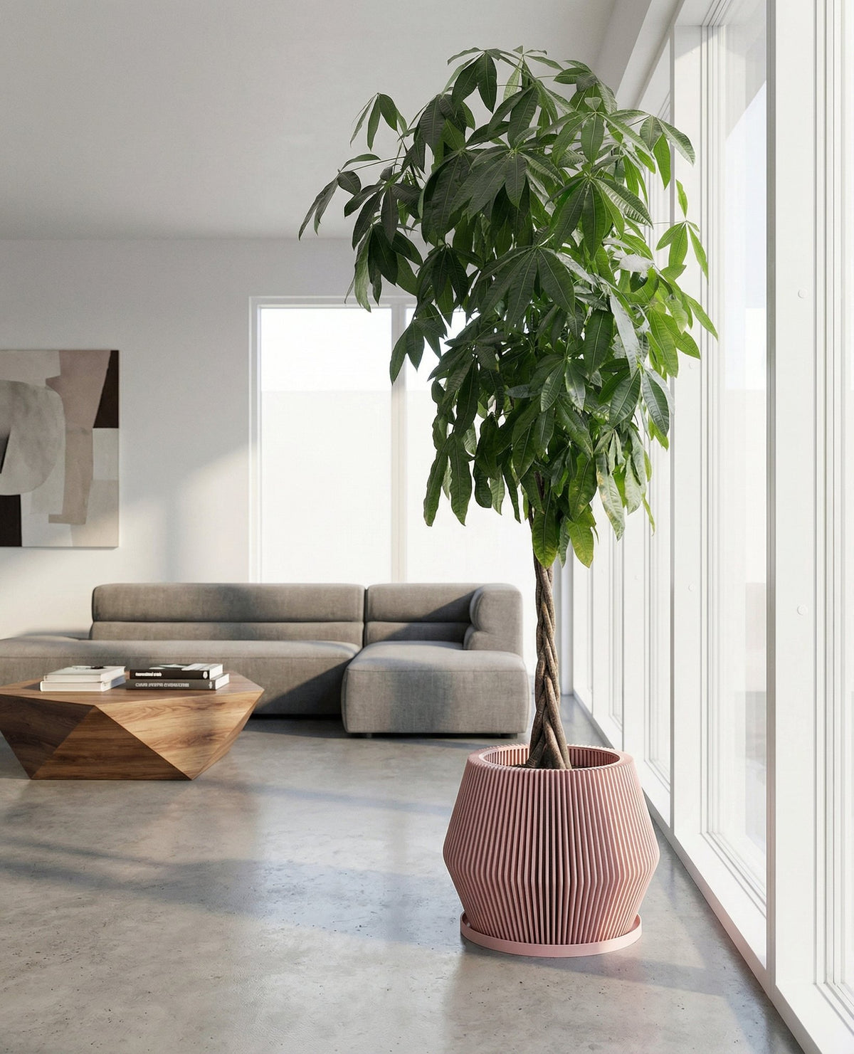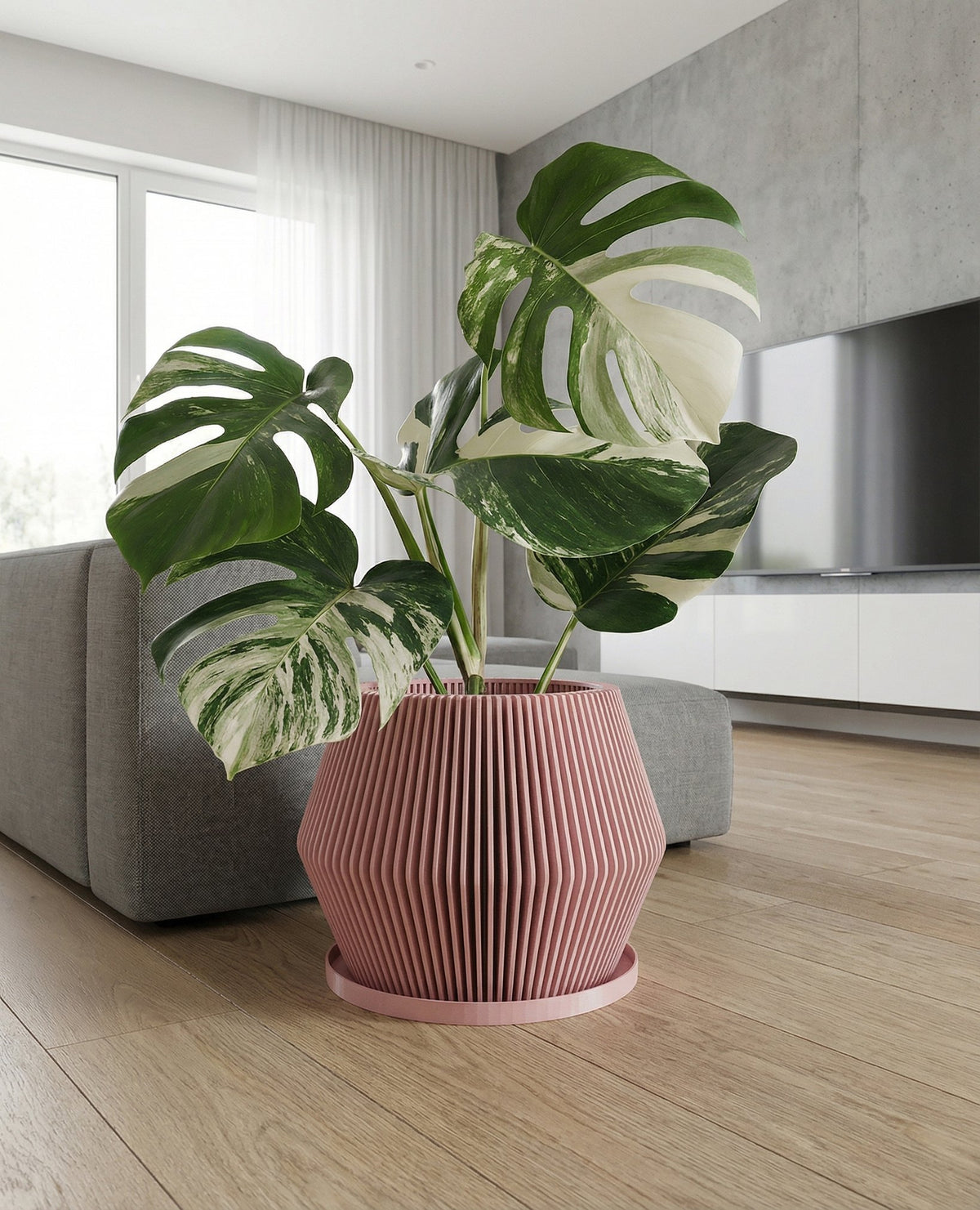 Imagine a blush-toned sunrise captured in a pot. This beauty, Made in Canada, brings a soft, sculptural elegance to any space. Crafted from plant-based plastic, its fluted design catches the light, creating a dance of shadows and highlights that perfectly complements your green friends.