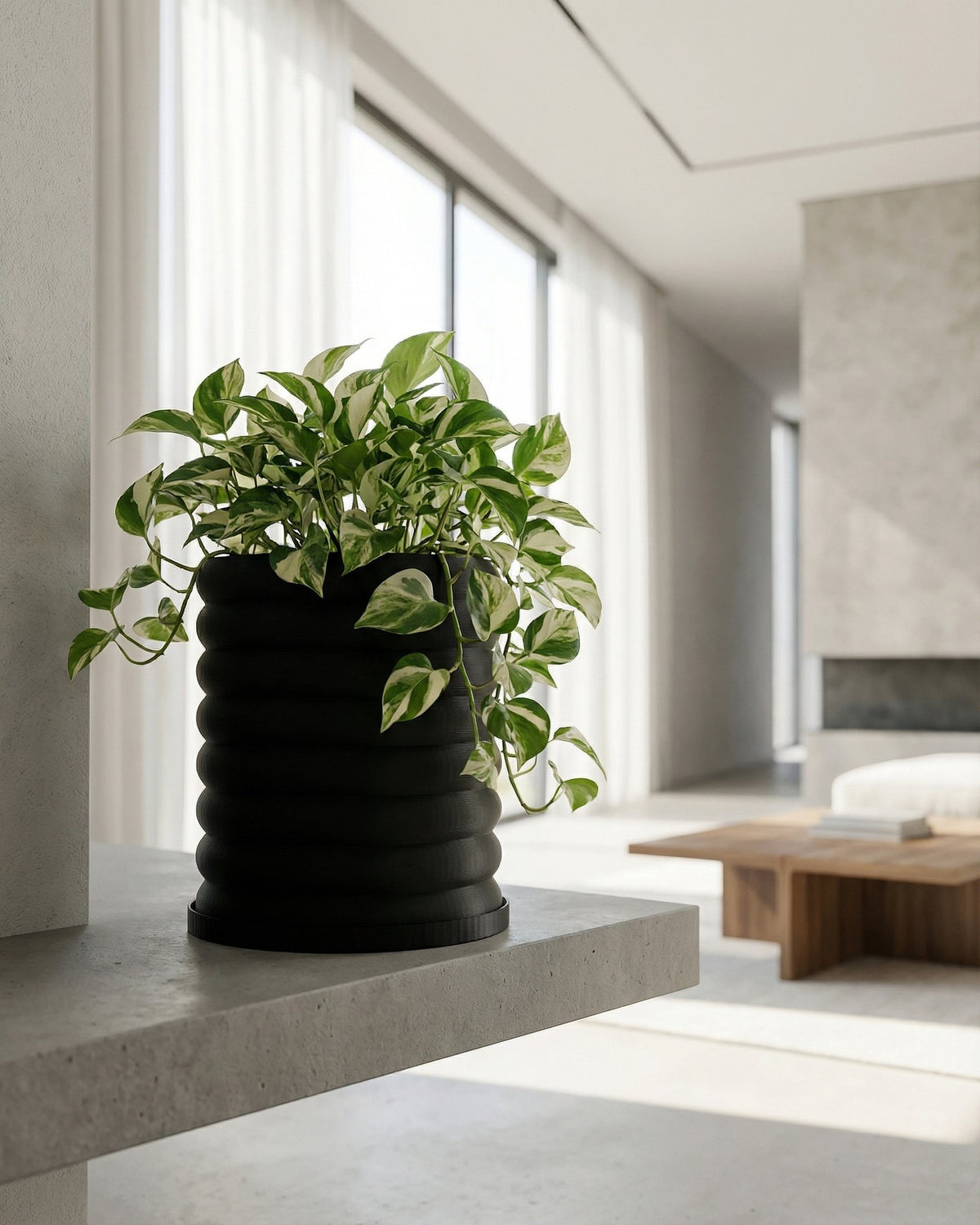 Sculptural curves meet modern cool in this striking black planter. Made in Canada from plant-based plastic, it's a statement piece that brings a touch of drama to your greenery. Let your plants pop against its bold silhouette!