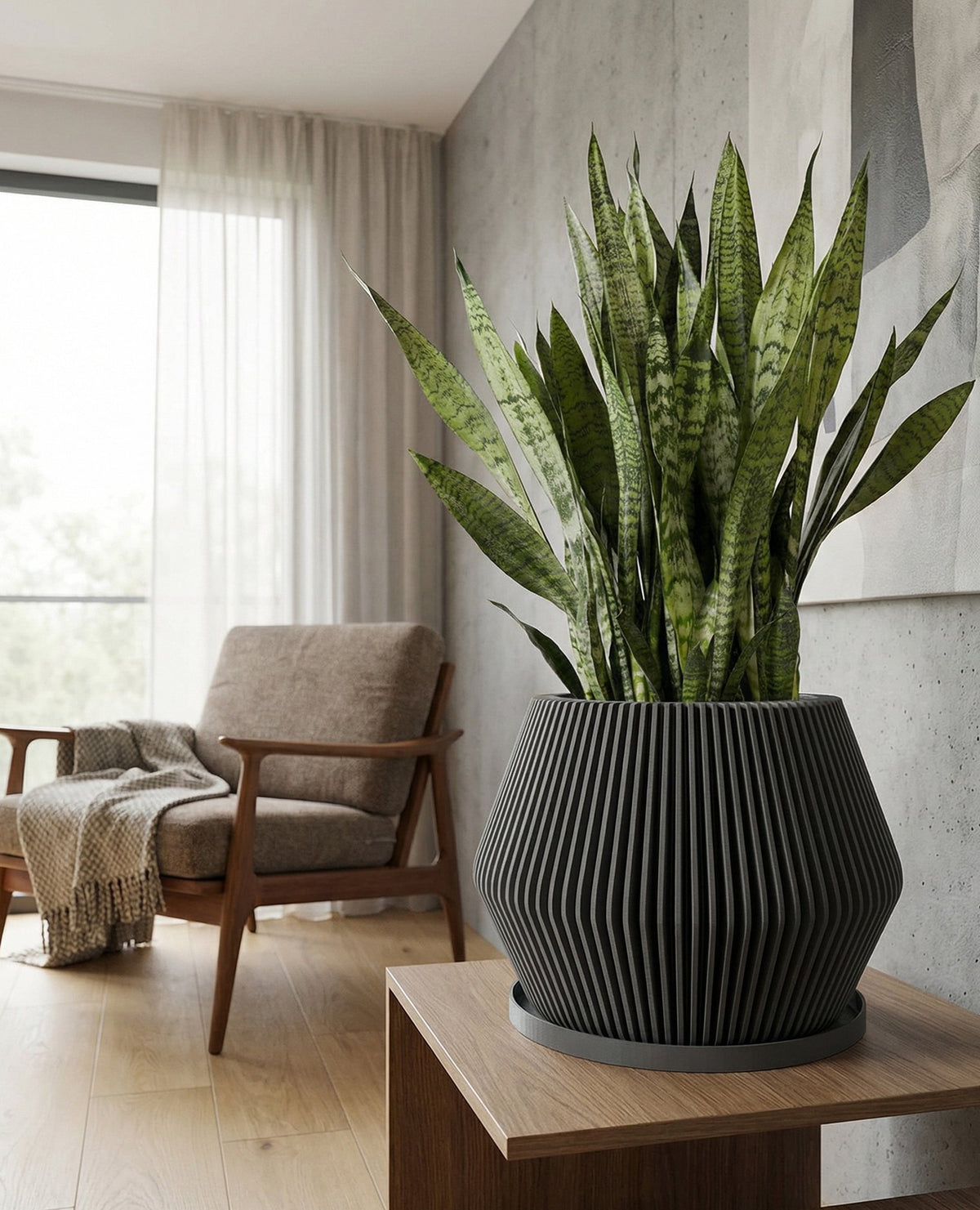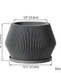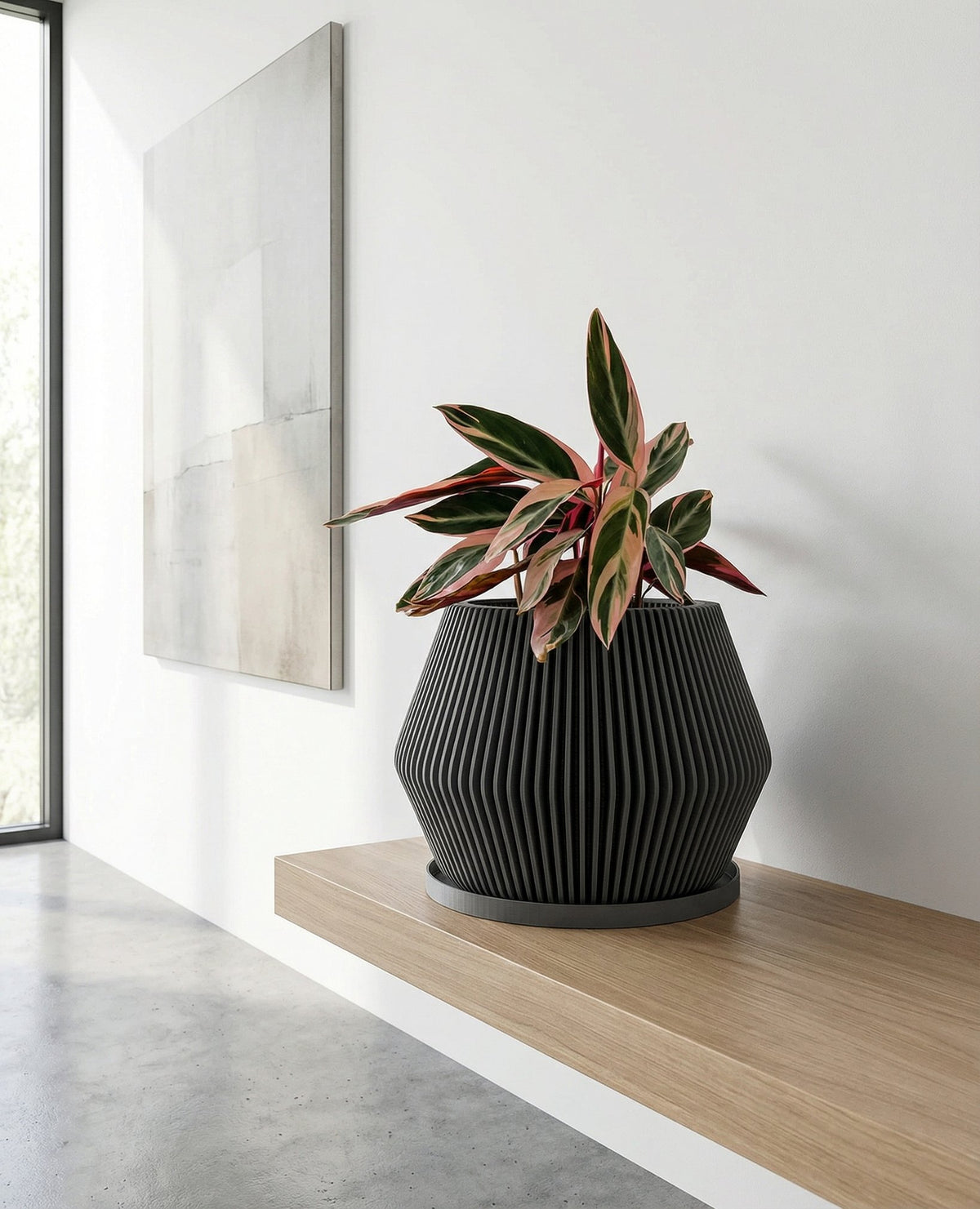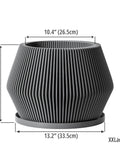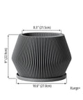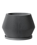 Sculpted shadows dance across its fluted form, a symphony of greys that whispers modern elegance. This beauty, Made in Canada from plant-based plastic, brings a touch of sophisticated drama to any space. Let its subtle, rhythmic texture be the grounding element your greenery deserves.