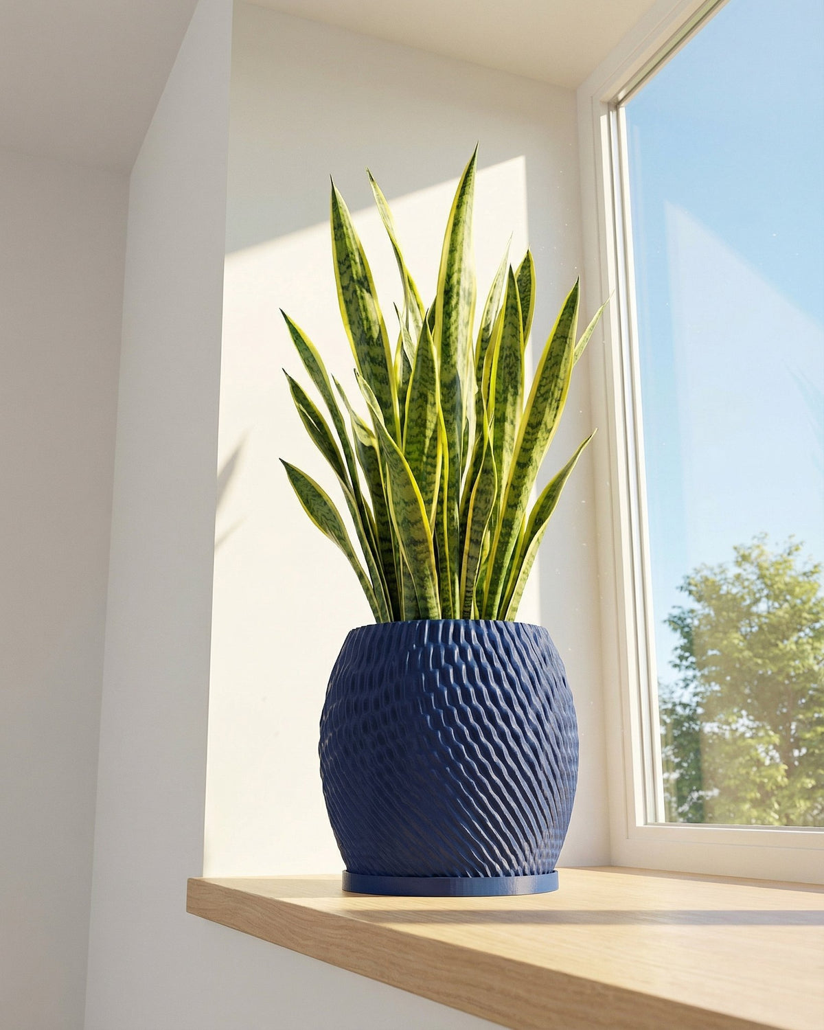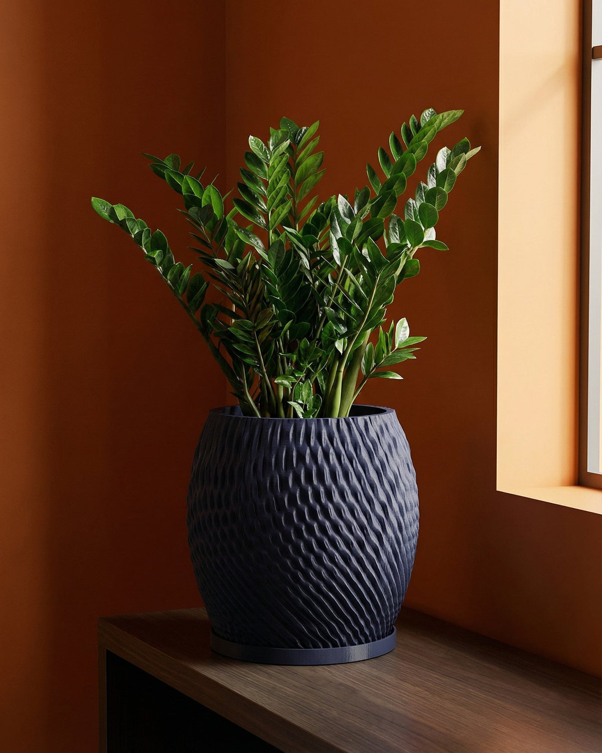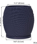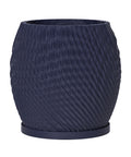 Imagine a twilight garden, where the deep indigo of dusk kisses a sculpted masterpiece. This pot, Made in Canada from plant-based plastic, isn't just a container; it's a statement. Swirling, hypnotic lines dance across its surface, catching the light and drawing the eye. It's a touch of modern magic, ready to cradle your green companions in style.