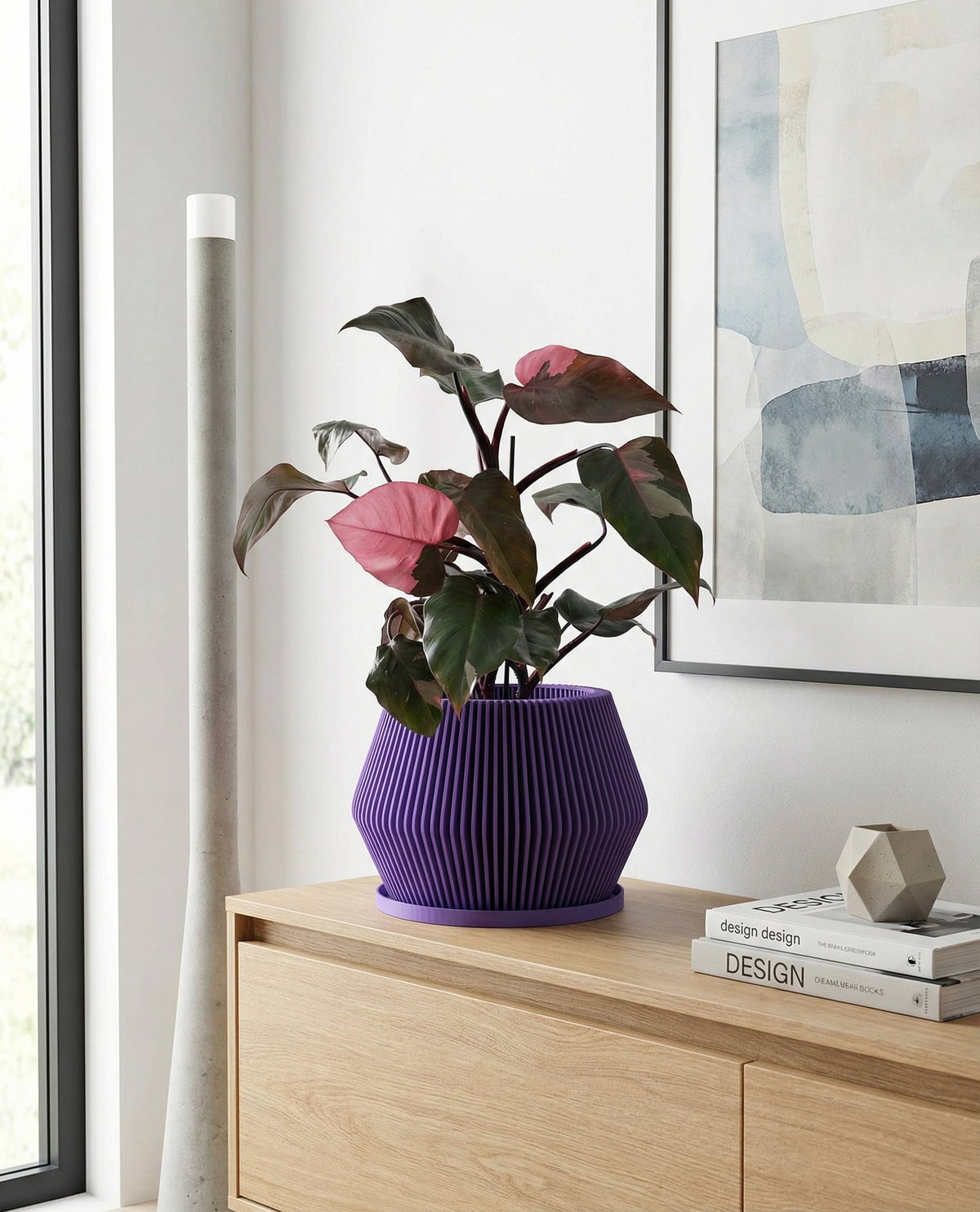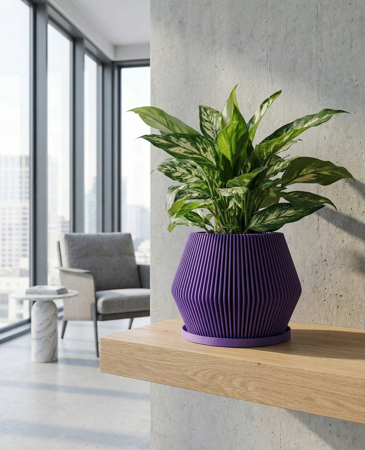 Imagine the softest lavender fields at twilight... now picture that color, spun into a pot. This beauty, Made in Canada from plant-based plastic, features a modern, fluted design that catches the light just so. It's a dreamy touch for any space.