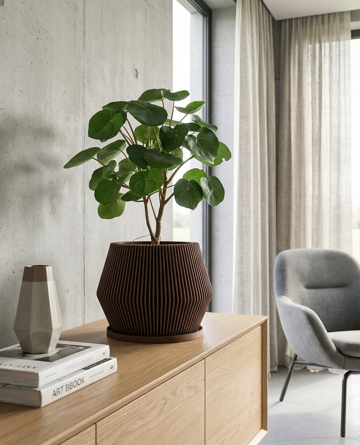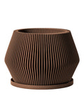 Imagine the warm glow of a setting sun, captured in a pot. This beauty, Made in Canada, boasts a rich, earthy brown hue that brings instant warmth to any space. Crafted from plant-based plastic, its vertical ribbed design adds a touch of modern elegance, creating a visual rhythm that's both striking and soothing. It's a little piece of sunshine for your plants (and your soul!).