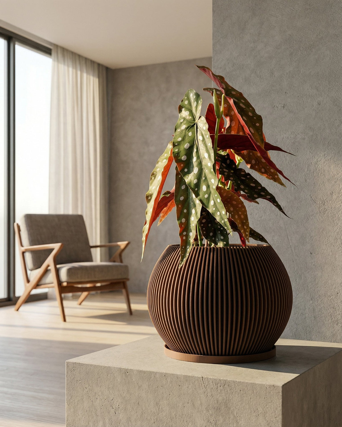 Imagine the soft glow of twilight dancing across a room, catching the warm, earthy tones of this captivating pot. Made in Canada from plant-based plastic, its unique, vertically-ribbed design brings a touch of modern elegance and grounded beauty to any space. It's a statement piece that whispers of sustainability and style, effortlessly blending into your home's story.