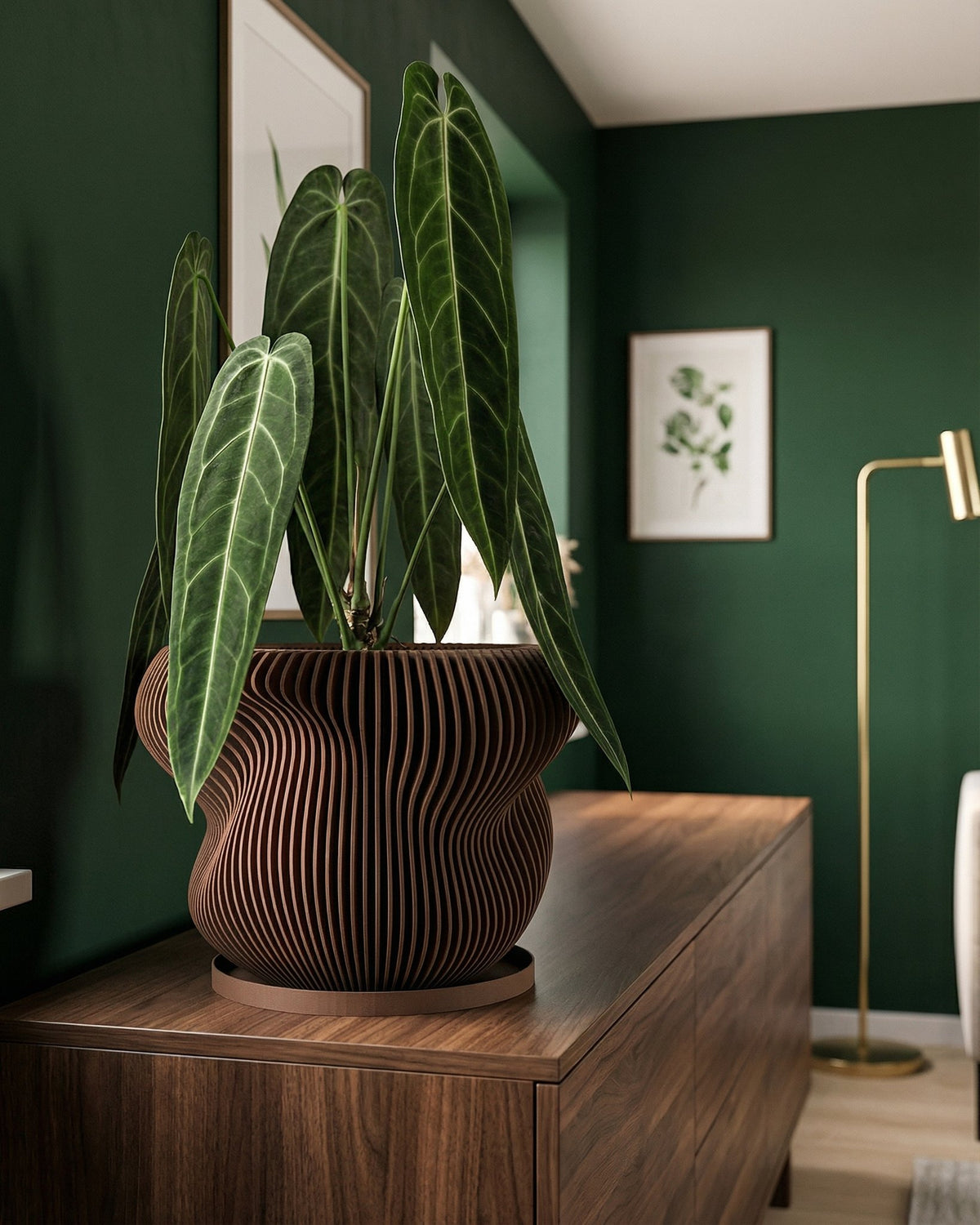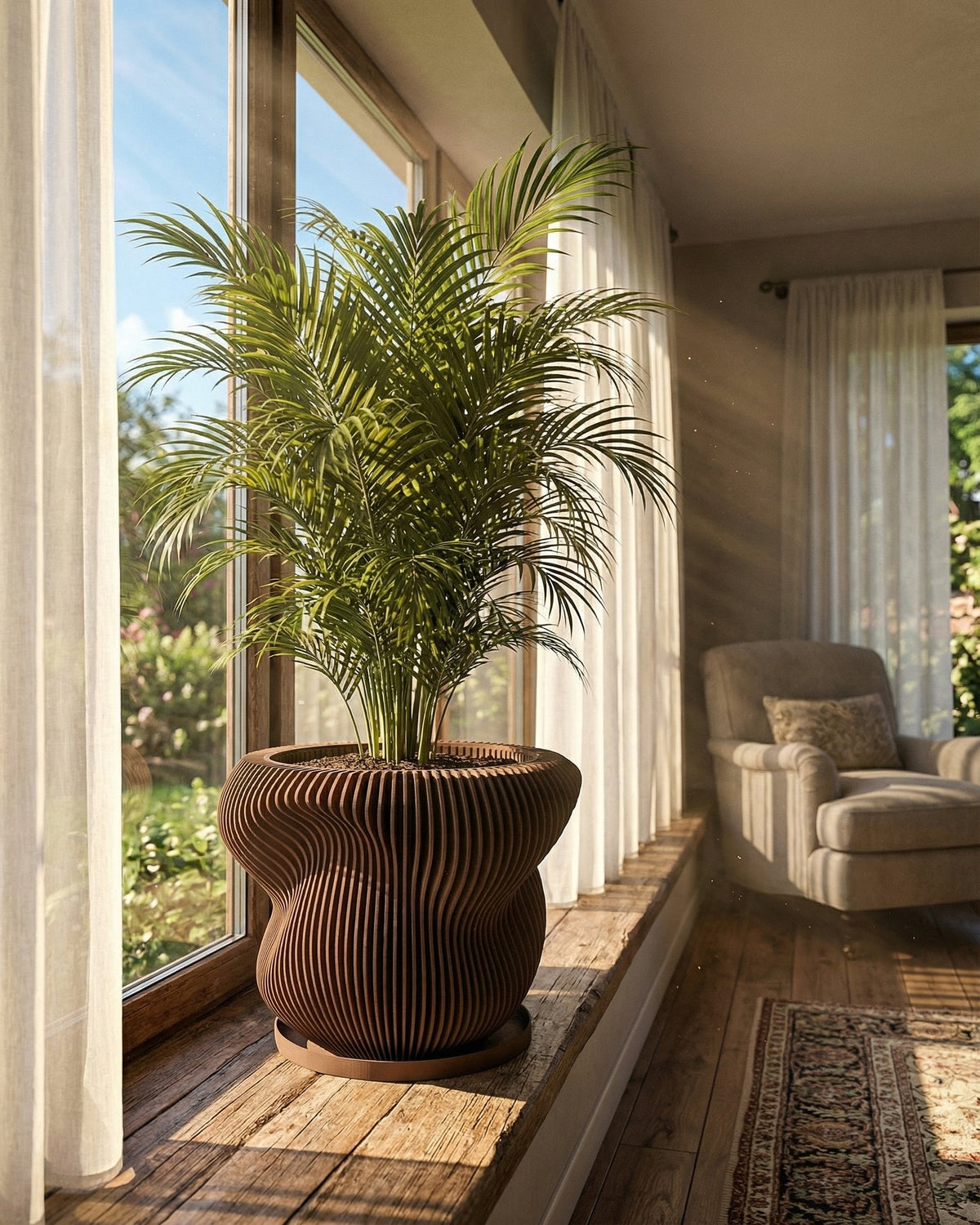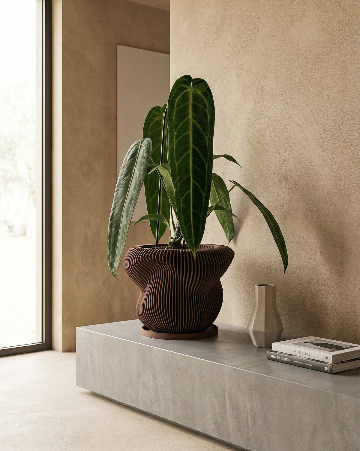 Imagine the soft glow of twilight dancing across a room, catching the warm, earthy tones of this captivating pot. Made in Canada from plant-based plastic, its unique, vertically-ribbed design brings a touch of modern elegance and grounded beauty to any space. It's a statement piece that whispers of sustainability and style, effortlessly blending into your home's story.