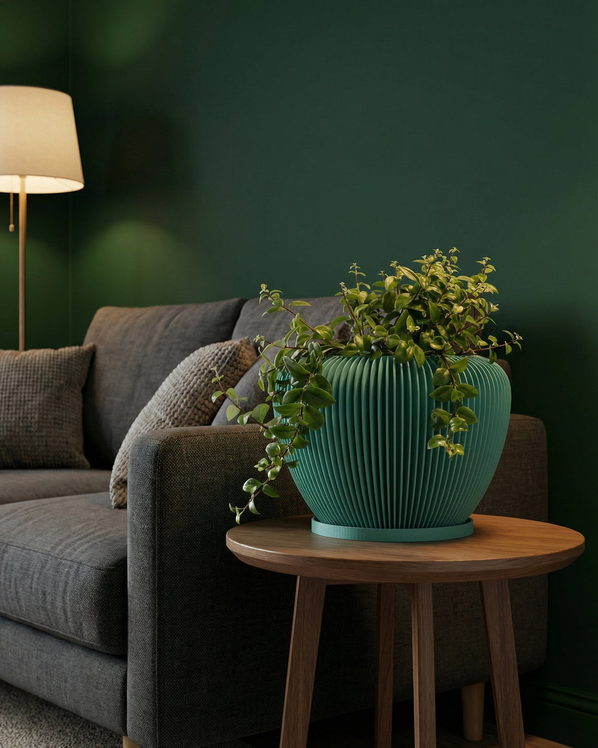 Bathed in sunlight, this dreamy teal pot brings a serene splash of color to your space. Its gentle, fluted form adds a touch of playful elegance, while the shadows create a dance of light and texture. Made in Canada from plant-based plastic, it’s a feel-good choice that’s as beautiful as it is responsible.