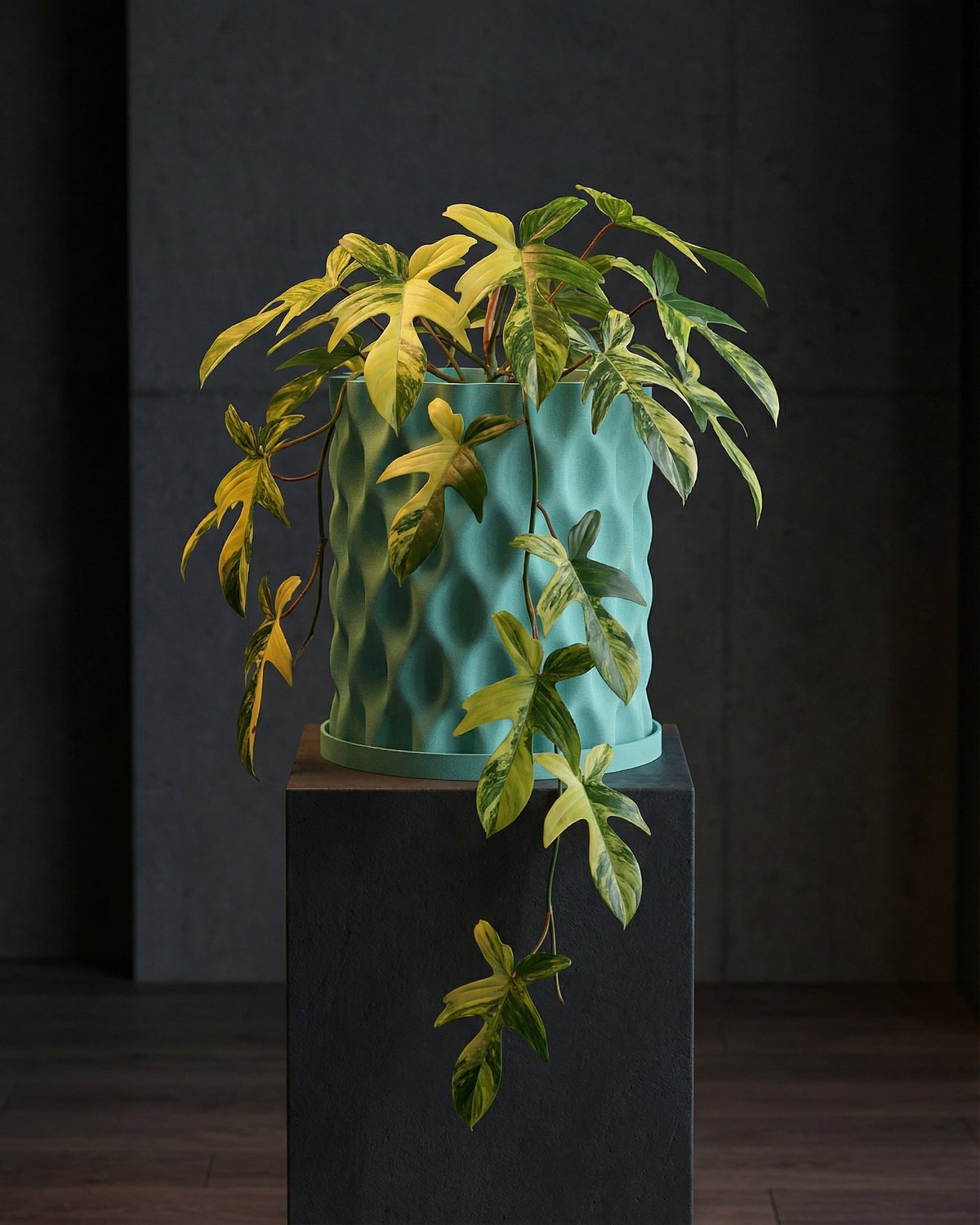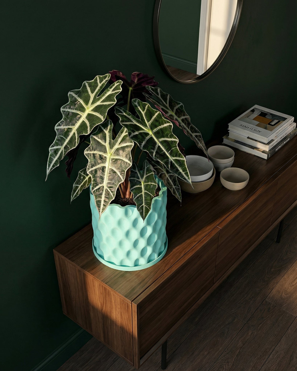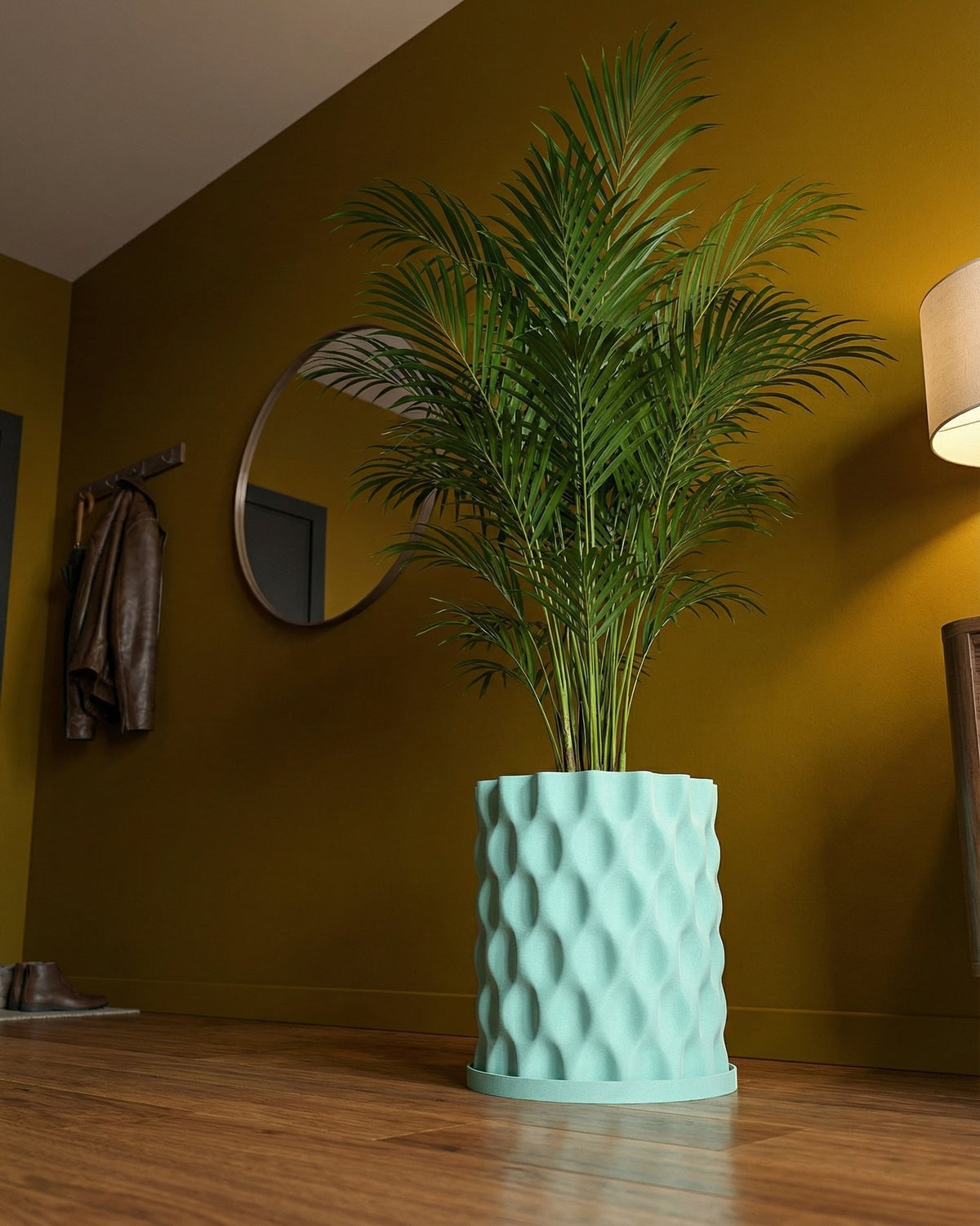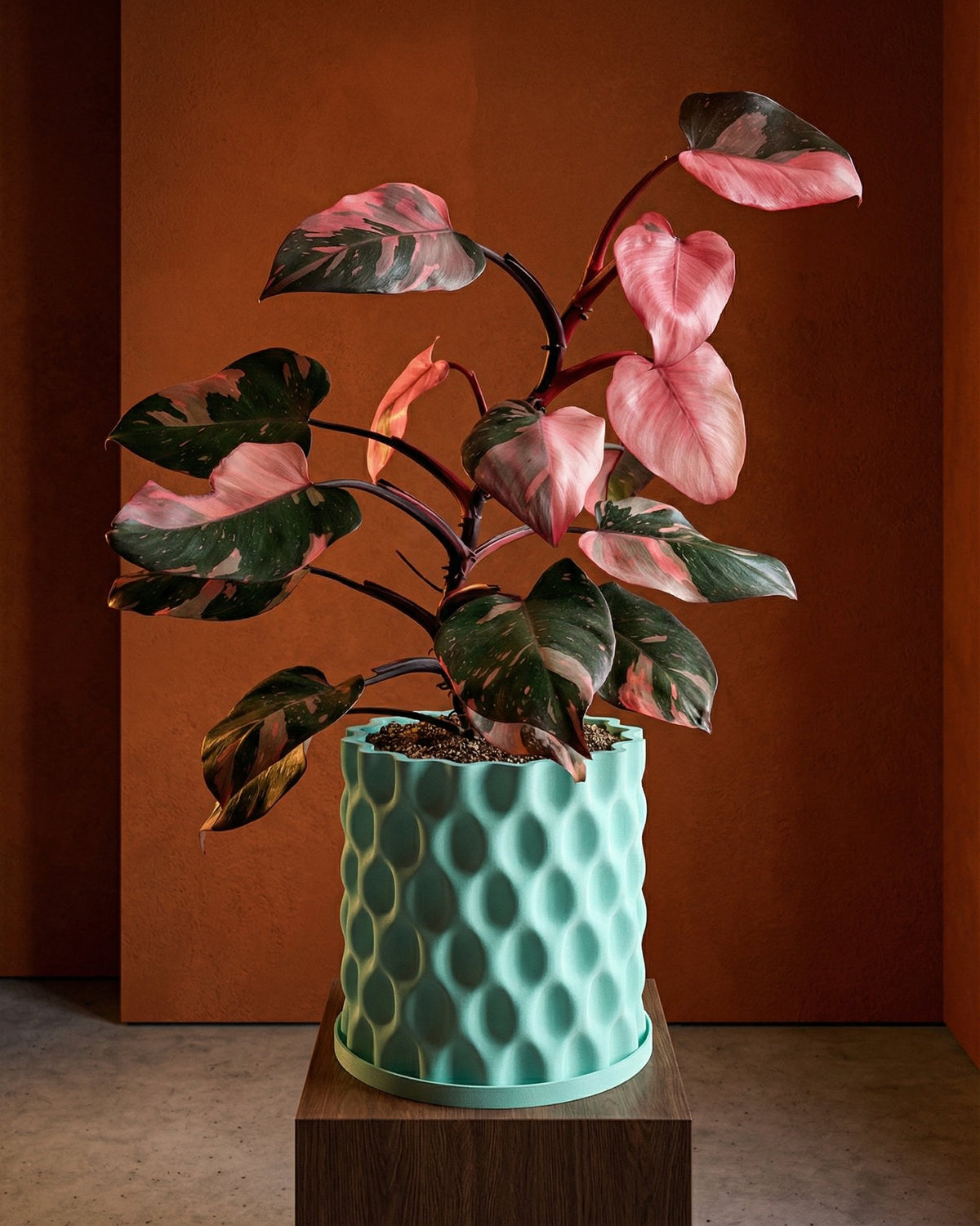 Bathed in soft light, this dreamy aqua pot brings a serene splash of color to your space. Its unique, rounded geometric pattern adds a playful, modern touch that’s sure to catch the eye. Made in Canada from plant-based plastic, it’s a feel-good choice that looks absolutely stunning.