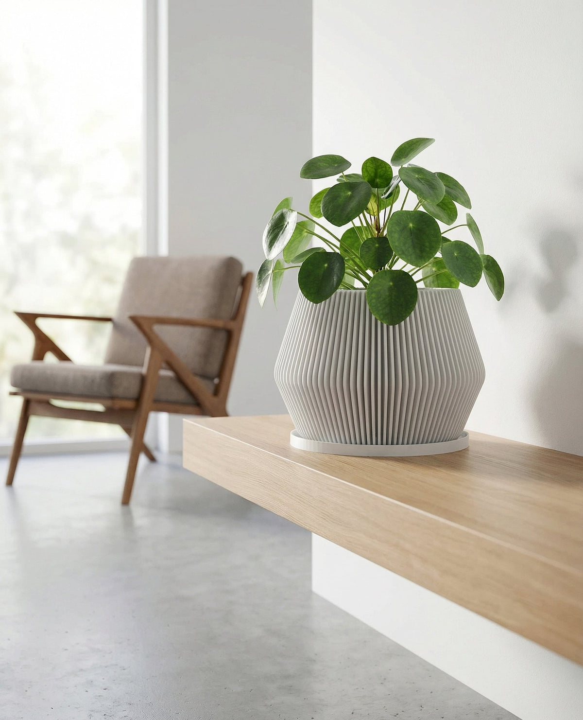 Bathed in soft light, this beauty brings a sense of calm to any space. The gentle curves and fluted texture of this pot create a dance of shadows, a quiet harmony that lets your plants truly shine. Made in Canada from plant-based plastic, it's a feel-good choice that looks amazing.