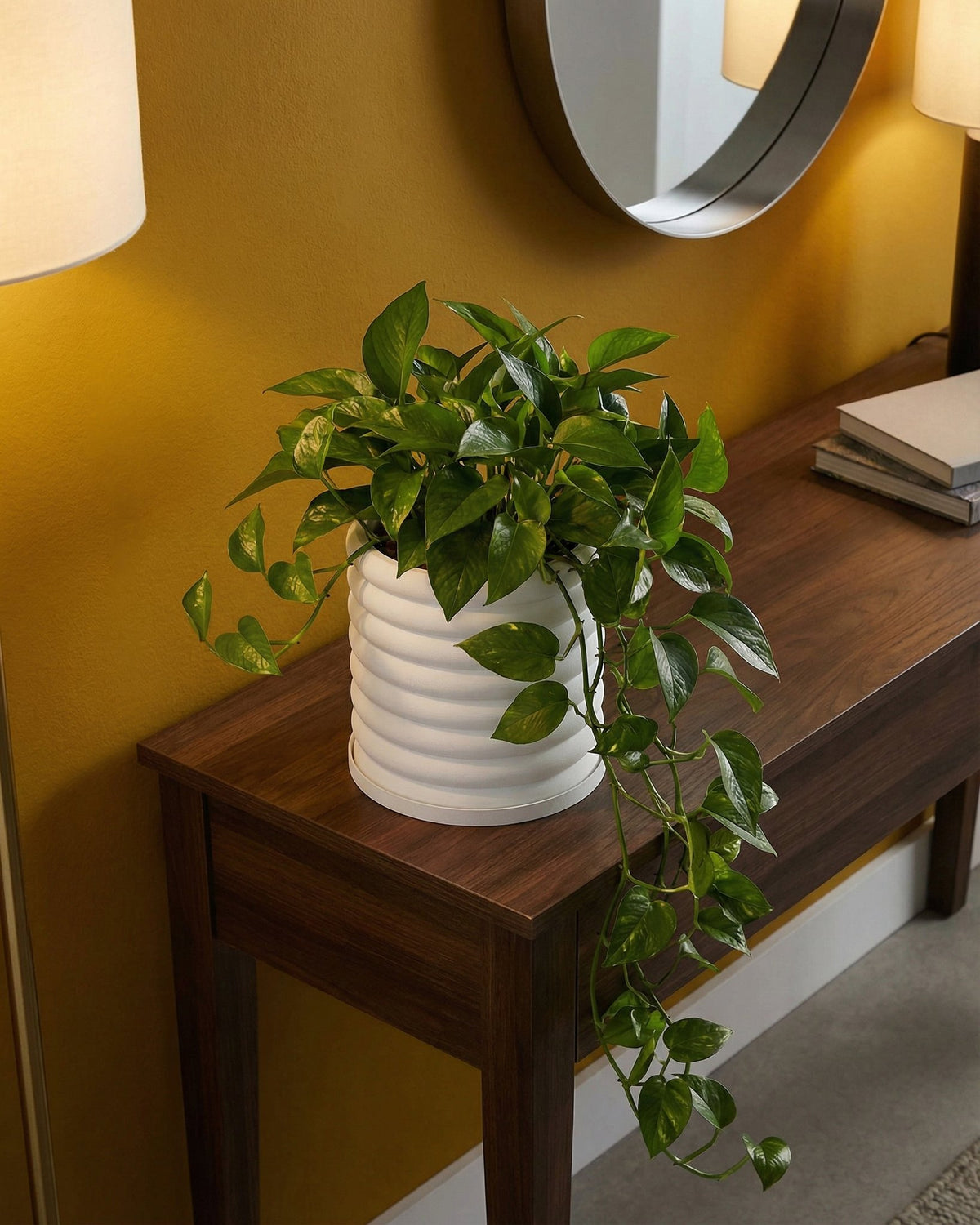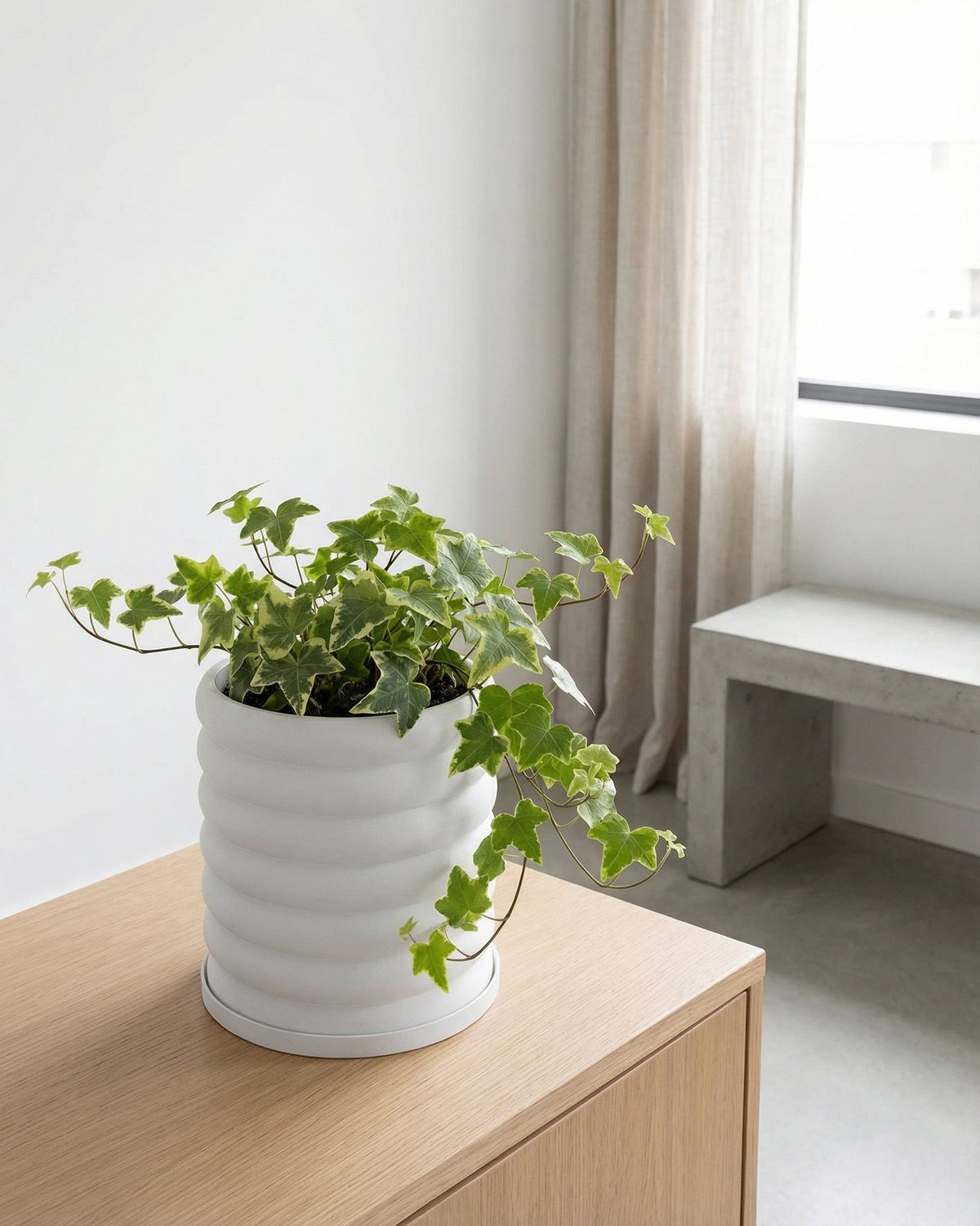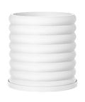 Bathed in soft light, this dreamy pot brings a touch of calm to any space. Its creamy white hue and gently ribbed texture create a sense of serenity, while the lush greenery it holds adds a pop of life and vibrancy. Made in Canada from plant-based plastic, it's a feel-good choice that's as beautiful as it is responsible.