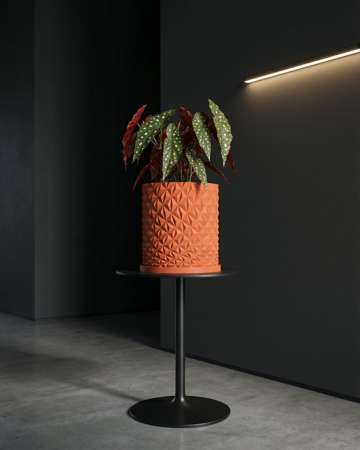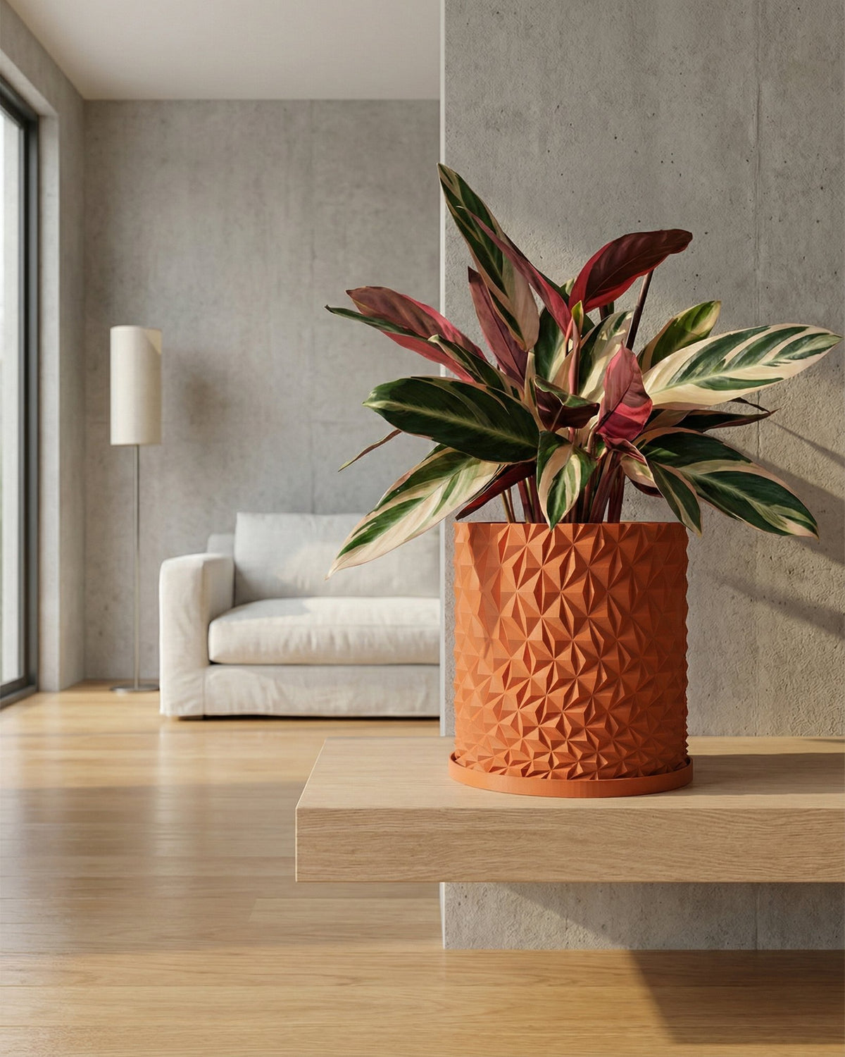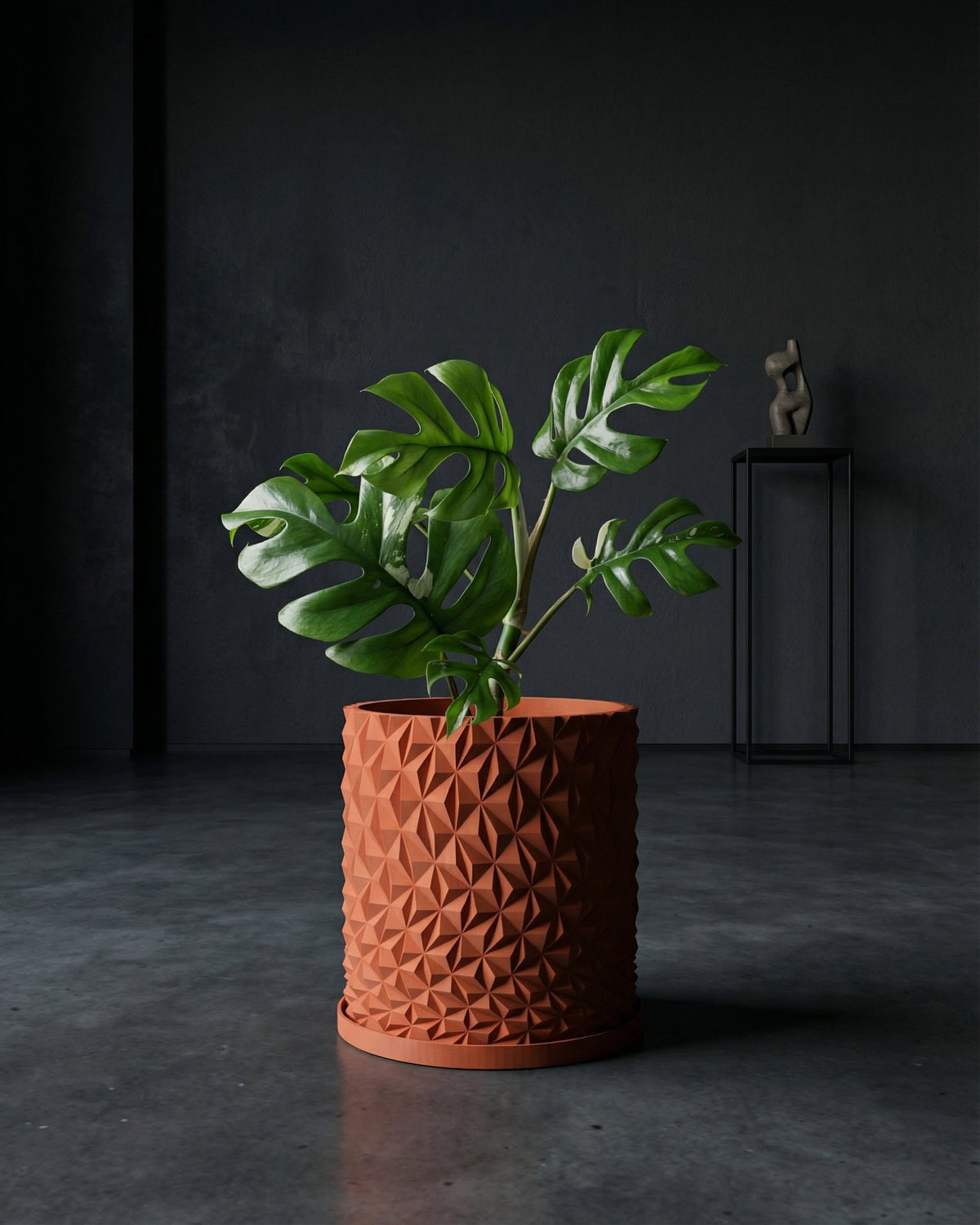 Imagine a sunset, captured in a pot. This terracotta dream, Made in Canada from plant-based plastic, boasts a mesmerizing geometric dance of light and shadow. Each triangular facet catches the eye, creating a textured masterpiece that elevates any plant it holds.